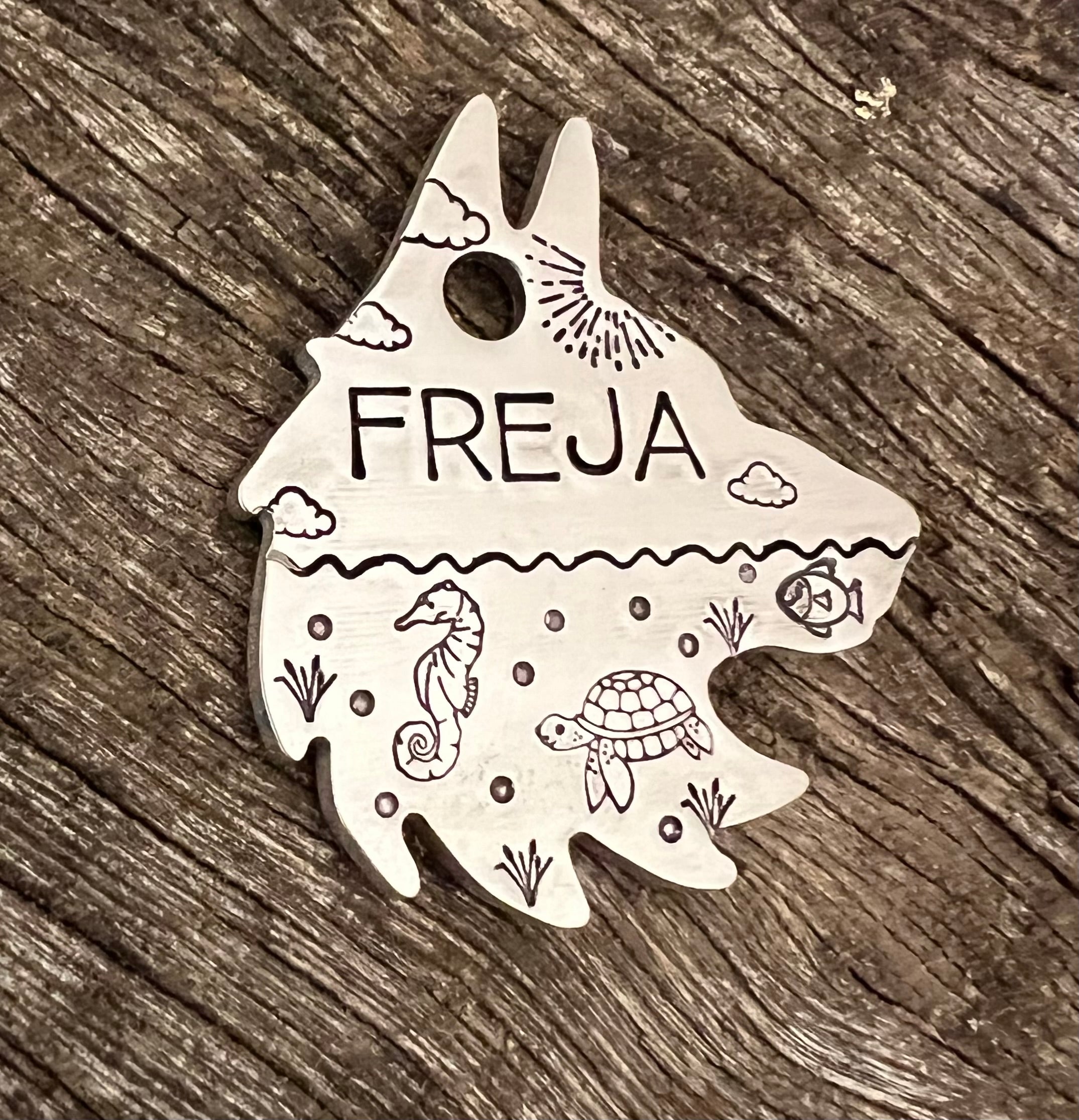 Our Freya tag is set in a beautiful under the depths of the ocean with a variety of different sea creatures floating about.